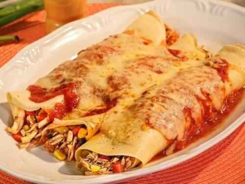 São duas deliciosas panquecas recheadas com frango desfiado e Catupiry.