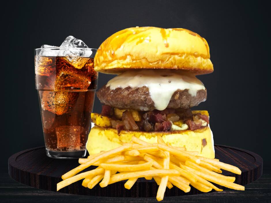 Pão brioche amanteigado, hambúrguer de 130g, queijo muçarela, bacon, banana frita, molho especial, acompanhado de suculentas batatas fritas e refrigerante de 200ml