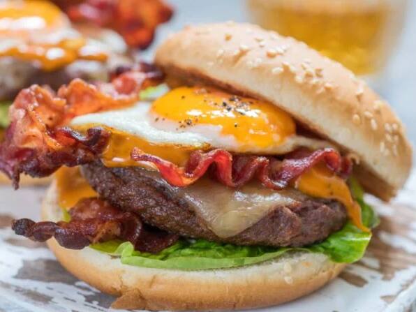 Pão, carne, bacon, queijo, ovo, milho, batata palha, alface e tomate