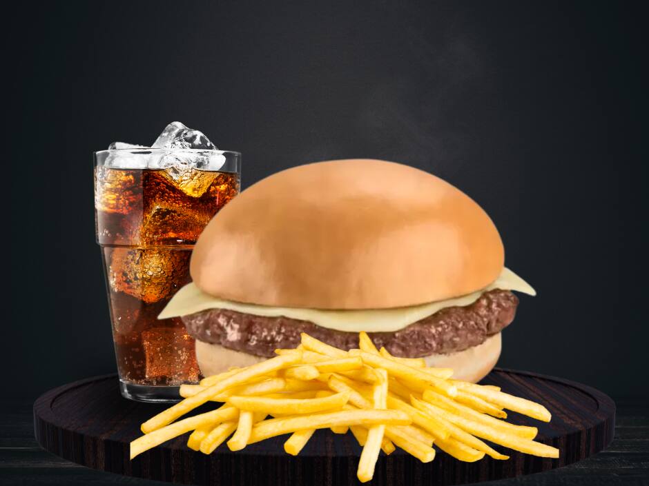 Combo tradicional com pão brioche amanteigado, hambúrguer de 90g, queijo muçarela, molho especial, acompanhado de deliciosas batatas fritas e refrigerante de 200ml